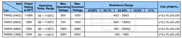 TAR系列电阻电气规格: